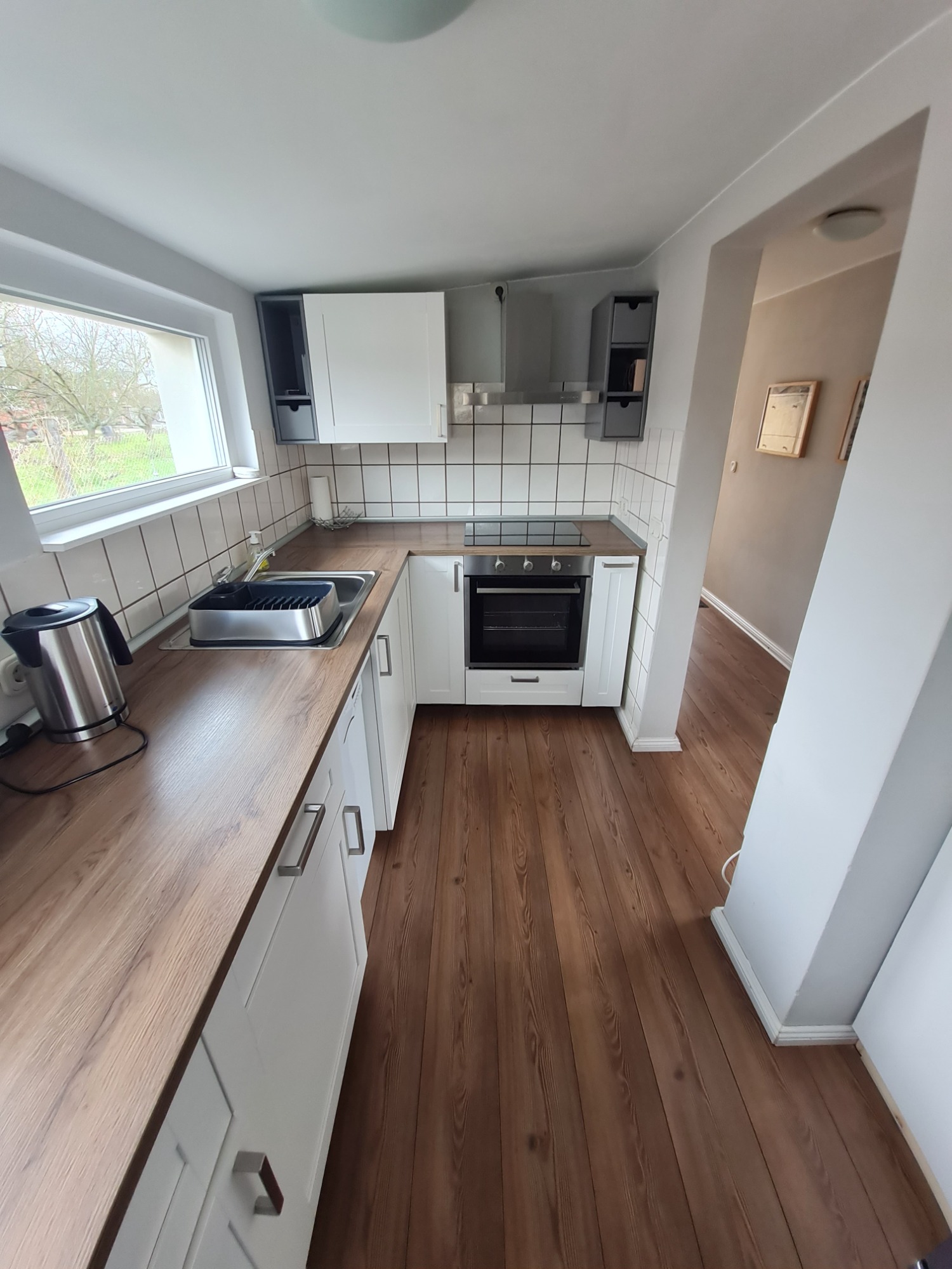 - Küchenausstattung: vier Cerankochfelder, Geschirrspüler, Dunstabzugshaube, Toaster, Wasserkocher und Kaffeemaschine